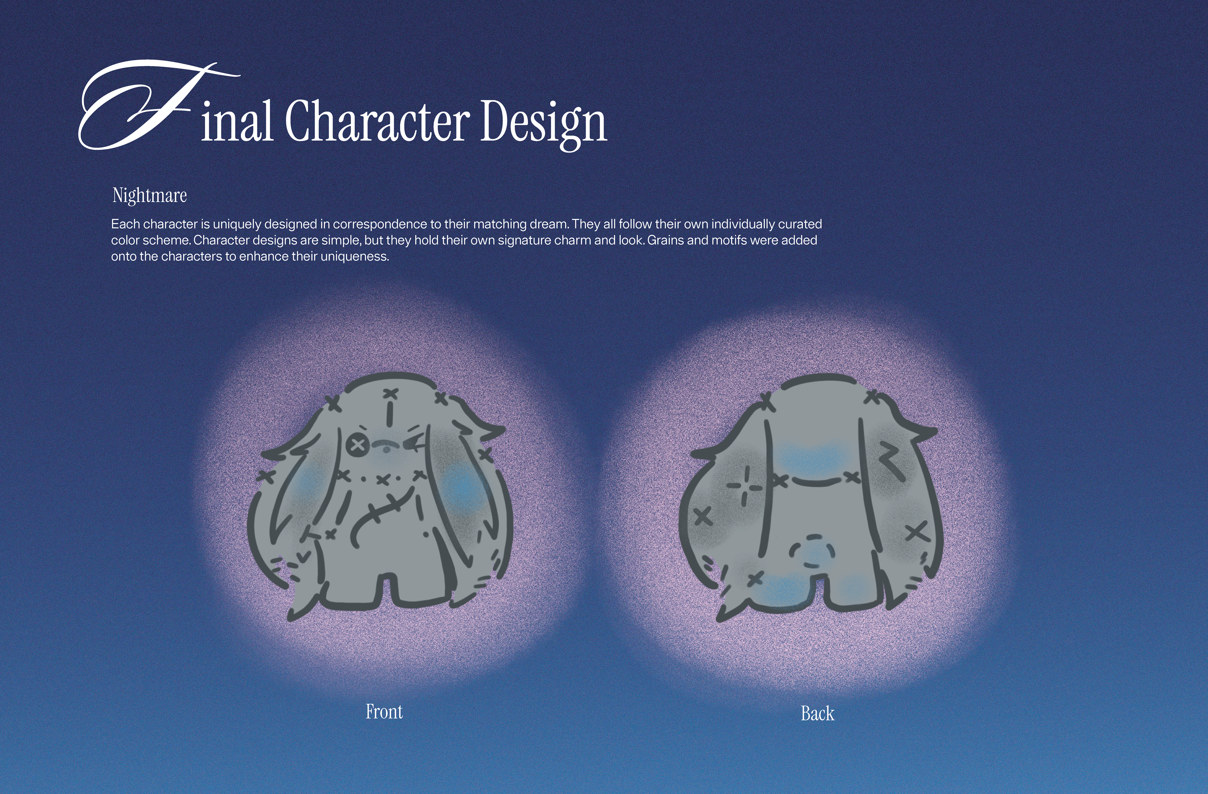 Dreamy Palz is a blind box series with characters that are cloud-like bunnies that all represent different themes of dreams such as: sweet, nightmare, daydream, and prophetic. The blind box brand was created for a motion graphic series that included an animated promotion video and an AR experience where users can immerse themselves into the Dreamy Palz world through fun collectible figurines.